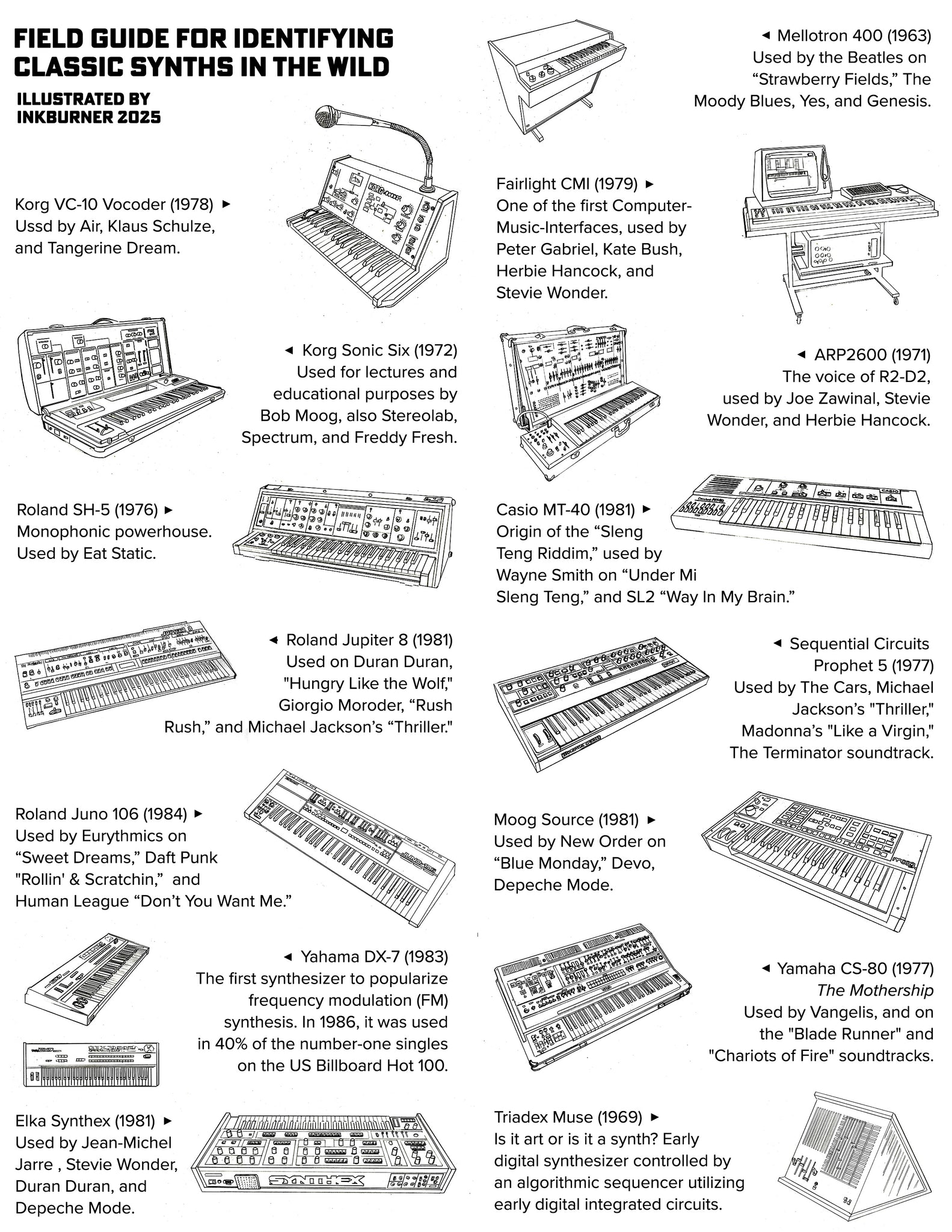 Inkburner and Synthnews bring you Vol 1 of their coloring book series, "Classic Synths". Handcrafted illustrations by Inkburner. From the introduction: "Growing up, I got to hear some of the very first synths take over popular music and change the way people related to sound. When I started making music and touring, one of my founding principles was “Live Synths on Stage!” Synthesizers just make me happy, and I have been drawing and painting pictures of the classics. This book represents some of my favorites from 1963-1984. I hope you will get as much joy out of them as I did!" - Jeff Wareham, Inkburner